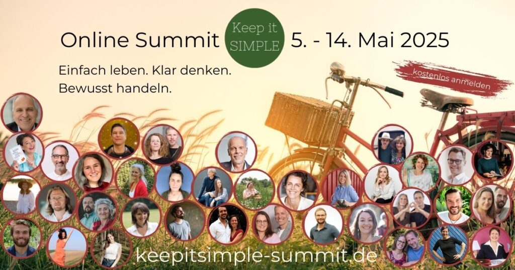 Diese Frage ist das zentrale Element des Keep it SIMPLE Summits – ein Online-Kongress für alle, die tief in sich wissen, dass echtes Glück im Einfachen zu finden ist.